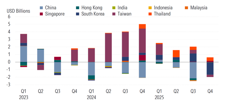 Source: Morningstar Direct. Data as of December 2025. China is not included in Q4 flows due to data unavailability.