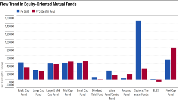Through FY2026 (till February), equity-oriented mutual fund categories garnered net inflows of INR 3,061 billion. While this marks a moderation compared with FY2025 (INR 4,171 billion), the flows remain meaningful, especially given the challenging market environment. The persistence of inflows during a period marked by heightened volatility and global uncertainties underscores the resilience of domestic investors.